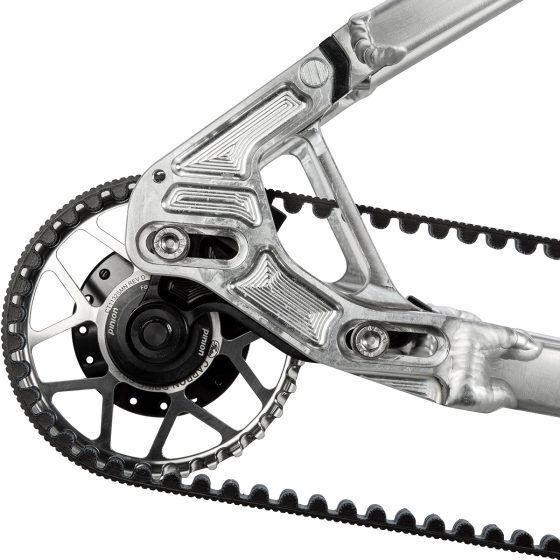 Slide Ausfallenden am Rahmenheck ermöglichen bei unseren Hardtails die Nutzung von Singlespeed Naben, ROHLOFF Getriebenaben und Naben für das PINION Getriebe in Verbindung mit einer Kette oder dem GATES Carbon Drive Riemenantrieb, ohne dass ein Kettenspanner oder Riemenspanner benötigt wird. Die Ausfallenden werden beidseitig verschiebbar und formschlüssig in horizontalen Nuten geführt, die an den Innenseiten der Heck-Frästeile liegen. Durch paralleles Zurückführen und mit Hilfe zweier Stellschrauben wird die korrekte Spur des Hinterrads und eine optimale Ketten- oder Riemenspannung justiert und beidseitig mittels Klemmschrauben fixiert. Slide Ausfallenden sind sowohl für den Boost Standard mit 148 x 12 mm erhältlich, als auch für ein 142 x 12 mm und ein 135 x 10 mm Achsmaß. Die Scheibenbremsaufnahme ist in das linke AFE integriert. Dadurch wird bei einer Verstellung keine Neujustierung des Bremssattels nötig.